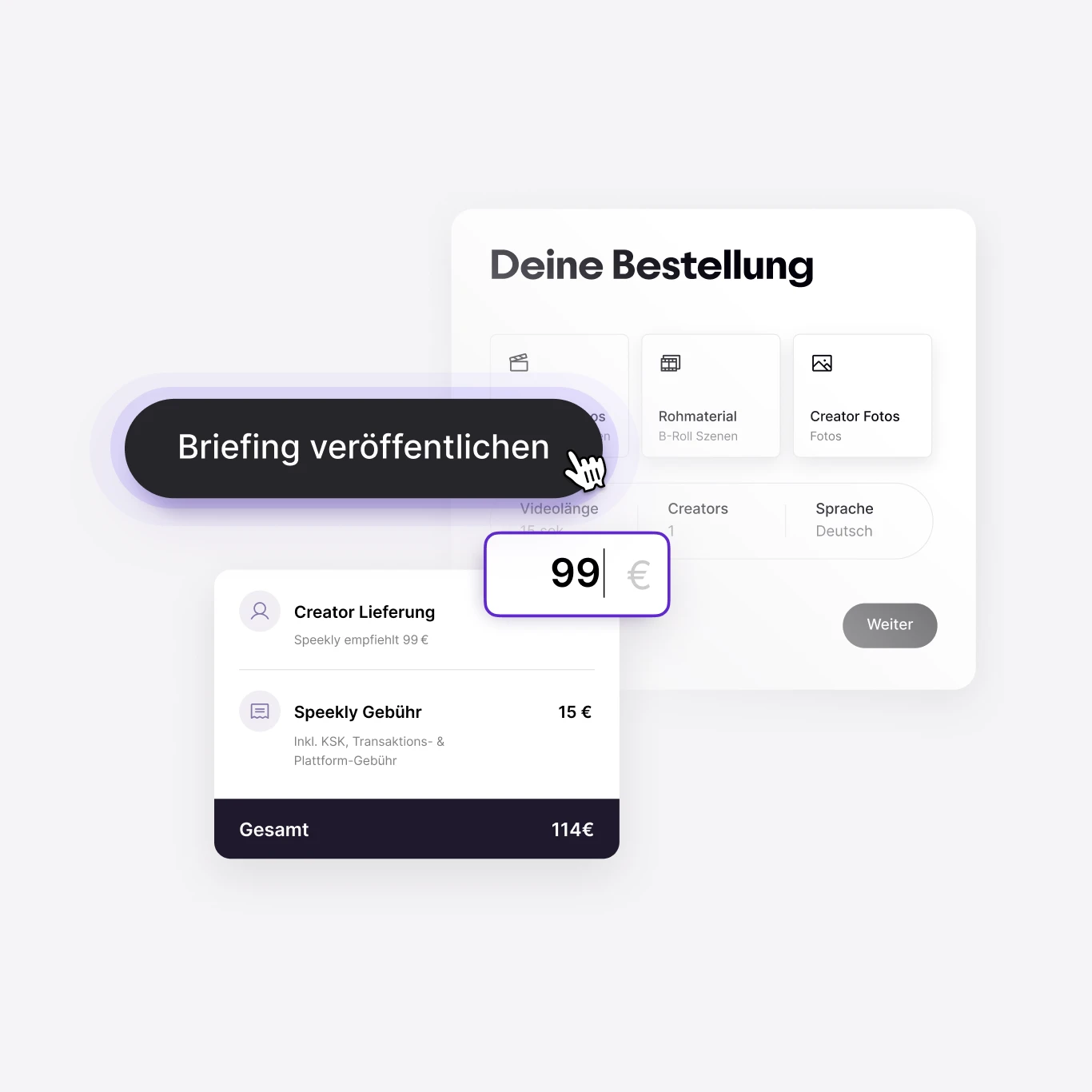 Du bist nicht an Speeklys Preise gebunden. Lege Preise & Creator-Payout selbst fest, zzgl. Speekly-Gebühr für KSK, Transaktion und Plattform.