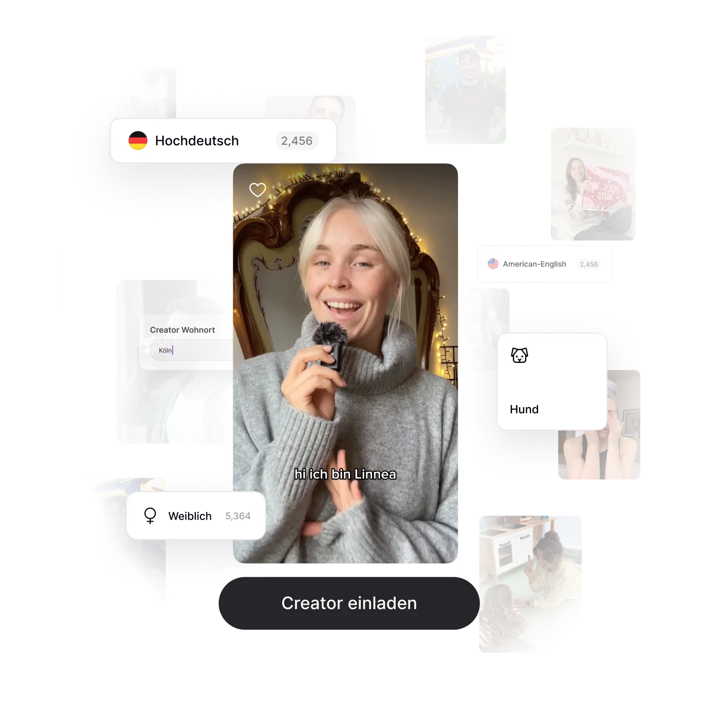 Durchsuche alle Creators in Speekly, nicht nur die, die sich beworben haben. Filtere nach Alter, Geschlecht, Dialekt, Drehorte, Kinder, Haustiere uvm.